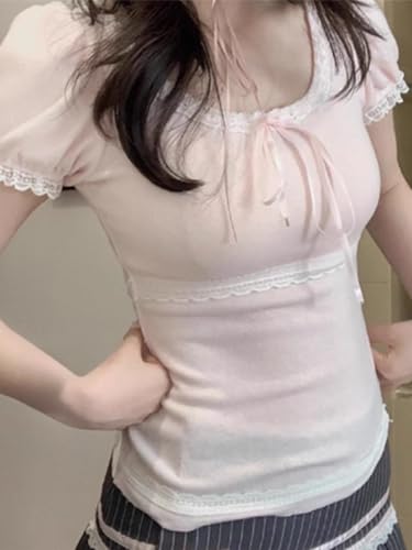 Coquette Cute Lace Trim Top Y2k Baby Tee Summer Short Sleeve V Neck Shirts 2000s Mcbling Vintage Fairy Grunge Top