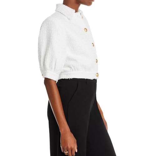 Women's Cropped Tweed Blazer Puff Sleeves Short Sleeve Jacket with Gold Buttons(White,XL)
