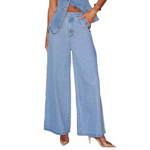 Women's Denim 2 Piece Set Sleeveless Button Down Jean Blazer Vest Tops and Wide Leg Jeans Two Piece Outfit Suits