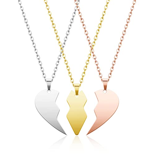 Material: Stainless SteelMetal type: Stainless SteelChain type: CableGem type: No Gemstone❤3pcs Puzzle Heart Necklace Set: Split puzzle heart pendant(all together makes a complete love heart shape) express love between friends, family, Comrade and so on. Memorial gift for graduation / birthday / team-building/ family reunion etc.❤Material: Stainless steel jewelry does not tarnish and oxidize, which can last longer than other jewelries. It is able to endure a lot of wear and tear. And it is amazingly hypoallergenic.❤Size: Whole Pendant: 35mm(1.38). Chain Length: 24, Chain width: 2mm. Quantity: 3 pieces necklace.❤3 Pieces Best Friends Forever Necklaces Set. One set include 3 color: Silver, Golden and Rose Gold. Heart Puzzle Matching Stainless Steel Pendant Necklaces, shared with your best friends or brother, sister silbing necklace gift, symbolized your eternal friendship and love.❤Great gift ideas: ideal birthday gifts,Valentines Day gifts,Graduation wedding engagement present,Christmas gifts ect. Perfect for everyday use. superior materials and excellent craftsmanship ensure long-lasting durability.