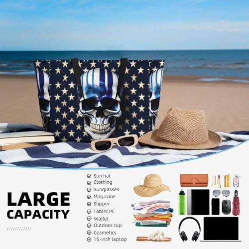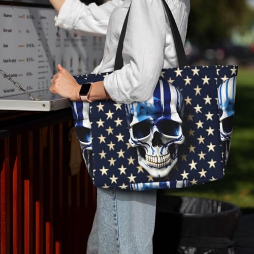 Fabric type: PolyesterCare instructions: Machine WashKeep Items Safe From Sand And Water: This Blue Stripe Stars Skull Beach Bag For Women Made Of Machine-Washable Polyester Fabric, Ensures Your Clothes, Phones, Electronics And Other Beach Essentials Stay Dry And Sand-Free. Effortlessly Switch To Clean Attire Post-Beach Fun.Family-Sized And Organized, Eliminate Clutter: With Dimensions Of 15L X 17.7H X 6.7W, This Blue Stripe Stars Skull Beach Bags For Women Vacation Easily Holds A Family'S Beach Accessories, Yet Still Keeps It Lightweight. It Features 7 Pockets With This Beach Bag You Can Bring Everything You Needed.Multiple Pockets: Our Blue Stripe Stars Skull Beach Bag Has Multiple Pockets, Making Item Classification More Convenient! There Are Two Large Pockets On Both Sides Of The Outer Side, And A Zippered Pocket On The Inner Side. The Zippered Pocket On The Inner Side Can Hold Valuable Items Such As Phones, Wallets, Etc.Secure Top Zipper, Keep Items Clean: The Blue Stripe Stars Skull Tote Bag'S Top Zipper Holds Both Straps Together, Offering Dual Protection Against Sand Intrusion And Spills. It Keeps Your Belongings Safe And Clean, Making It An Essential Beach Companion.Versatile Carrying Options Based On Needs: Sling The Blue Stripe Stars Skull Beach Bag Tote Over The Shoulder For Hands Free, And Handheld For Heavy Items. cozy Webbing Straps Make Transport Easy, Whether You'Re Heading To The Beach Or Using The Blue Stripe Stars Skull Bag For Shopping Or As A Swim Bag, Pool Bag. Perfect for everyday use. superior materials and excellent craftsmanship ensure long-lasting durability.
