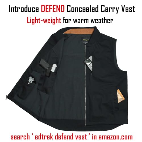 Fabric type: 100% CottonCare instructions: Machine WashOrigin: ImportedCONCEALED CARRY - Contains 4 interior concealed carry pockets, 2 on each side. Upper pockets were built for concealed weapon and fit most guns, pockets are reinforced for durability. Below each holster are pockets for magazines to make reloading effortless10 UTILITY POCKETS - 4 conceal carry pockets inside, 2 chest pockets (one for ID & Travel Documents, one slotted-utility pocket for glasses and pencil), 2 handwarmer pockets with snaps, 2 rapid access pockets (one for smart phone, one slotted-utility pocket that’s ideal for hammer, screwdrivers or penlights). Great for work, travel and daily useWATERPROOF AND WINDPROOF - Work doesn't stop for thunderstorms or rain. The rugged canvas is reinforced with waterproof PTFE ARCTIC-TECH membrane to make this vest waterproof and windproof. Keep your body and weapons dry even in rainy dayCLASSIC LOOKS WITH SUPERIOR PERFORMANCE - The most versatile, functional and practical vest we make. It is timeless looks with durable canvas and quilted lining for warmth.Styled with a drop tail design that is slightly longer in the back to keeep you warm. Zipper is heavy duty for durablity. Looks good and professional in autumn and winterFIT – EDTREK concealed carry vest provides you with a comfortable fit that can be worn all day long. Size runs a little large, please order size down for a snug fit, if you wear this vest outside jacket, follow your regular size. If womens need this vest, please order size down Perfect for everyday use. premium materials and excellent craftsmanship ensure long-lasting durability.