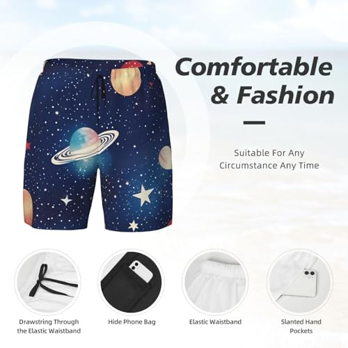 Fabric type: 100% PolyesterClosure type: ElasticSize Length (In/Cm) 1/2 Hips (In/Cm) 1/2 Waist(In/Cm) S 18.1/46 21.9/55.5 13.2/33.5 M 18.7/47.5 22.8/58 14.4/36 L 19.3/49 23.8/60.5 15.2/38.5 Xl 20/50.5 24.8/63 16.1/41 Xxl 20.5/52 25.8/65.5 17.1/43.5 3xl 21/53.5 26.8/68 18.1/46Material: Made With A Shell Of Polyester And A Lining Of 92 Polyester And 8 Spandex, These Starry Sky Universe Space Print Swim Trunks Men Offer Ultimate Comfort. The Outer Layer Is Breathable Mesh Fabric While The Inner Compression Liner Ensures No Chafing And Keeps The Shorts From Sticking To Your Skin When Wet.Advanced Performance: This Double-Layered Construction Provides Superior Breathability And Stretch. The Compression Liner Offers Additional Privacy Protection And Features A Hidden Pocket For Storing Small Items Like Your Phone Or Keys.Versatile Usage: For Swimming, Surfing, Fishing, Running, Gym Workouts, Lounging At Home, Or As Everyday Casual Wear, These Starry Sky Universe Space Print Mens Bathing Suit 7 Inch Inseam Are Designed For Multiple Activities Ensuring You Stay Comfortable And fashionable.Thoughtful Design: Equipped With An Elastic Waistband With Drawstring For Adjustable Fit, Two Side Pockets, And A Convenient Hidden Pocket In The Compression Liner, These Swim Shorts Provide Both Convenience And Security. Perfect for everyday use. superior materials and excellent craftsmanship ensure long-lasting durability.