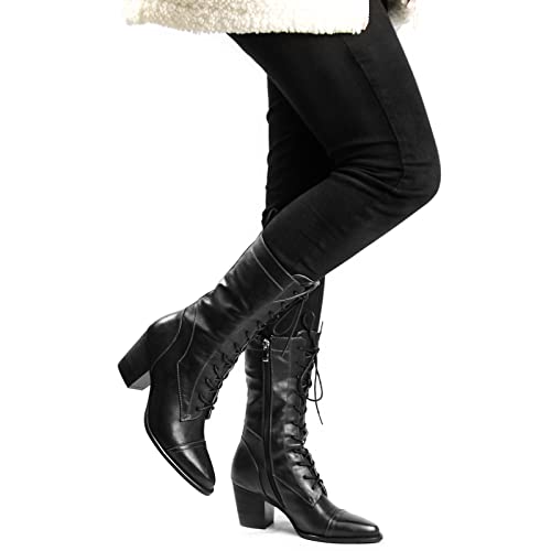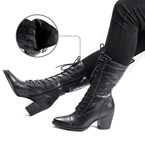 UTIKLIOU Women's Mid Calf Boots Lace up Combat Boots Leather Side Zipper Winter Boots Faux Fur Lining