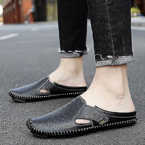 Helenbra Men's Hollow Backless Handmade Leather Mules Sandals,Summer Hook & Loop Breathable Slingback Non-slip smooth Sole pleasant Slip-on Home Office Casual Flat Sandals Slippers