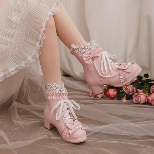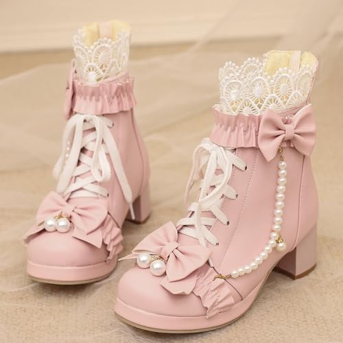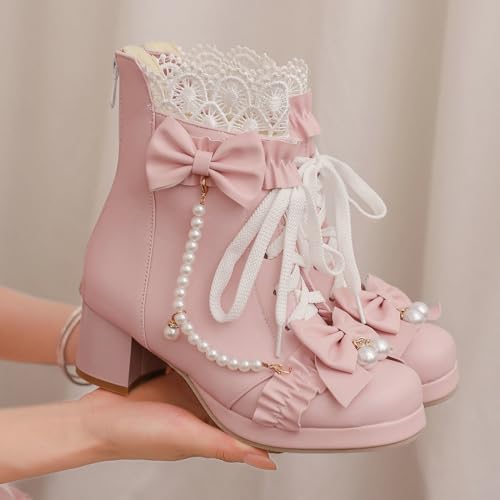 More information about LUXMAX Women Cute Lolita Boots Chunky Mid Heel Ankle Boots with Bow Platform Lace Up Booties with Pearl
