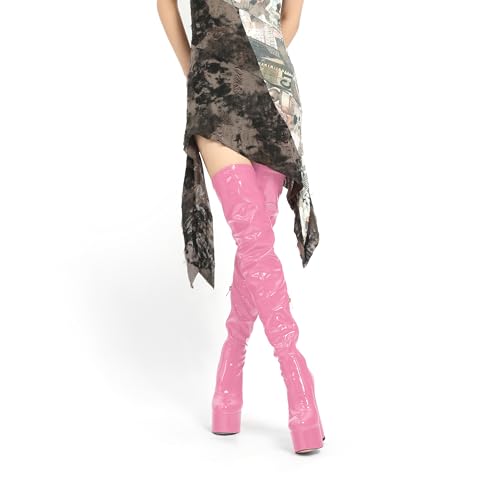 WAYDERNS Over the Knee Boots for Women Patent Leather Platform Block High Heel Round Toe 5.9 Inch Side Zipper Long Boots Sexy Dating Party Evening Thigh High Boots