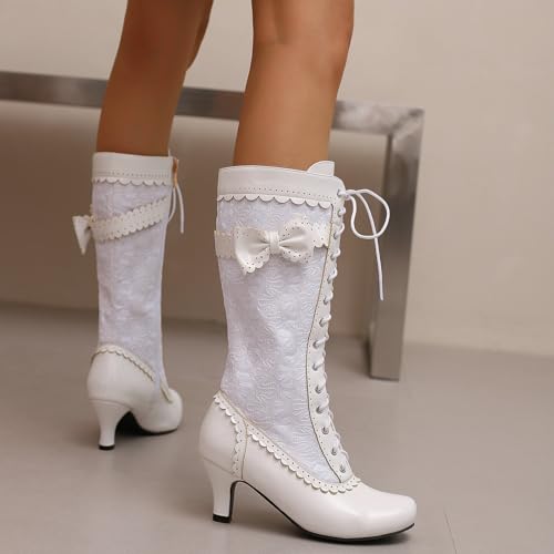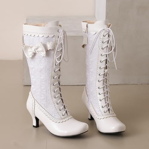 LUXMAX Women Gothic Victorian Boots Low Kitten Heel Mid Calf Boots Lace Up Cute Bow Boots for Ladies Witch Shoes