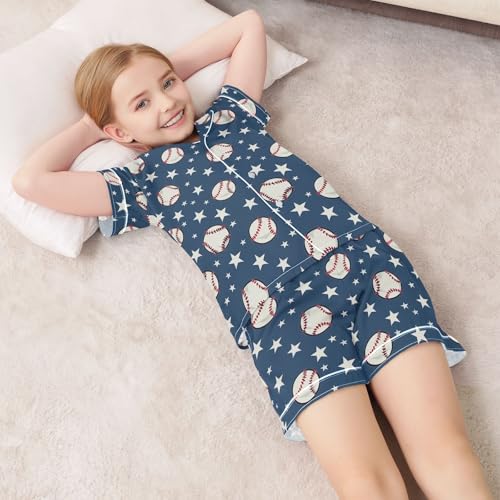 Cartoon Baseball and Star Summer Satin Pajama Set, Cute Button-Down Sleepwear Pj Set for Sleep Wears