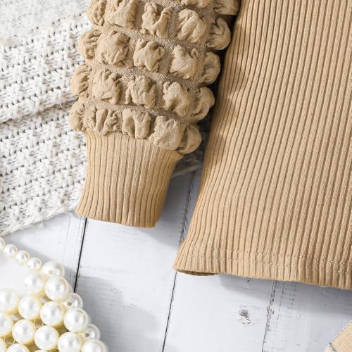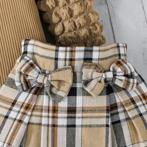 Noubeau Toddler Girls Plaid Outfits Girls Puff Sleeve Knit Ribbed Shirt Tops Plaid Skirt Set Kids Fall Winter Clothes