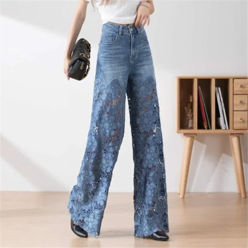 Women Elegant Jeans High Waist Lace Patchwork Pantalones Hollow Out Oversized Casual Loose Pants