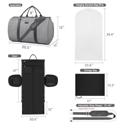 3Pcs Set Garment Duffel Bags for Travel: Large duffel bag measures 20.5L*11H*12W, can hold necessities for 3-6 days. Expanded size is 49L*20.5L, with a compartment for storing suits and long dresses. Extra 2 hanging garment bags (size: 60L*43W), keep your suit away from dust, damp and dirt. 1 drawstring organizer bag (Size: 17L*12.5W) for your other travel essentials. This garment duffle bags set can be used for home storage and travel. Help you organize and maximize your space.Hanging Clothes Bag - Keep Clothes Clean and Unwrinkled: The garment duffel bag offers multiple pockets and compartments to easily store your clothing, accessories, toiletries and other items to keep your belongings organized. The built-in garment hanging pocket with ensures that your formal wear, suit or dress will always stay neat and flat during your trip, without worrying about wrinkles and deformation. Used as a duffle bag, weekender bag, suit bag, clothes bag, carry-on luggage bag, etc.Convertible Duffle Bag with Waterproof Shoes Pocket: This foldable garment bag work perfect as a travel duffel bag after assembled. The left side pocket of this garment bag is a waterproof PVC lined shoes pouch can hold up to 2 pairs shoes, wet/dirty clothes organized and separate from your other belongings, keep other things in duffle bag clean and tidy. The water-resistant material of the shoes pocket can be easily wiped clean with a damp cloth, making it simple to maintain.Carry-On Garment Bag with Suitcase Trolley Sleeve: Backside sleeve allows you to easily slide your bag onto the handle of your suitcase trolley, making it more convenient and plush. The travel bag also has a back zip pocket for holding your smartphone, IDs, or passport, which you need quick access to. The sturdy handles allow you to easily carry the garment duffel bag through the airport, or you can use the detachable and adjustable shoulder strap (range: 25-48) for hands-free travel.Premium Quality Garment Bag for Men Women: With the fancy design of combining the feature of garment bag and duffel Bag. Made with premium fabrics, smooth zippers, comfortable handles, making this bag is scratch-resistant, anti-tear & water-resistant. The ingenious foldable design allows for effortless storage, making it an ideal choice for those seeking a well-made and capacious alternative to conventional garment bags. It's perfect for both men and women who want to travel in style. Perfect for everyday use. High quality materials and excellent craftsmanship ensure long-lasting durability.