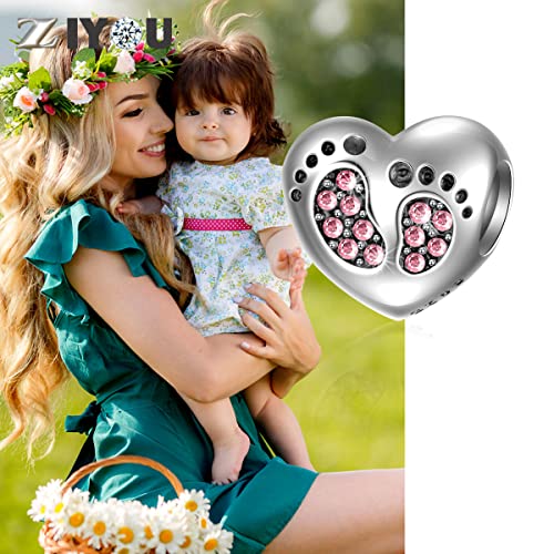 Baby Shower Gifts brand-new Baby Footprint Birthstone Charm, 925 Sterling Silver Feet on Heart Beads, fits European Birthday Bracelet, Gifts for Mom/Wife/Kids