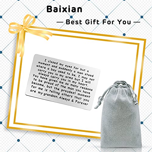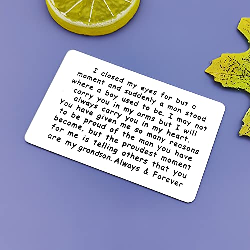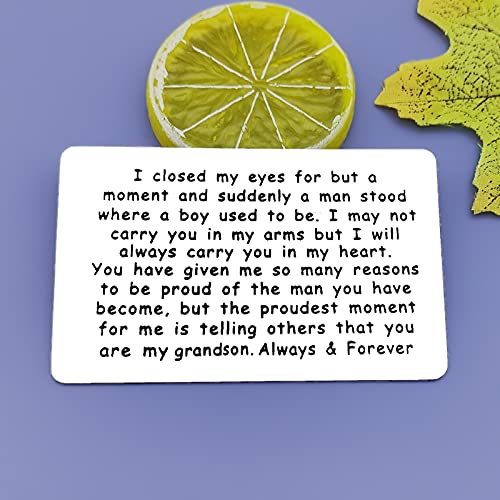 Grandson Gifts from Grandma Grandpa: I closed my eyes for but a moment and suddenly a man stood where a boy used to be. I may not carry you in my arms but I will always carry you in my heart. You have given me so many reasons to be proud of the man you have become, but the proudest moment for me is telling others that you are my grandson. Always & Forever.Encouragement quotes for grandson from grandmother,grandfather.Grandson Graduation Gifts: Our wallet card is an ideal gift for grandchildren. It can be used as a great-grandson birthday gift, graduation gift, homecoming gift, new job gift, Christmas gift, wedding gift, coming-of-age ceremony souvenir gift, Anniversary gift, Fathers Day gift , Valentines Day, etc.Inspirational Grandson Gifts:Whenever your dear grandson opens his wallet, a happy smile will appear on his face . A wallet card with a love message, it can help you convey your love.Keep this token in your grandson's wallet as a reminder everyday, he will know how much you love and support him.Perfect inspirational gift for grandson,encouragement grandson gift for birthday,graduation and so on.Grandson Engraved Wallet Insert: Card size: 55*86mm (2.17*3.39 inches). Made of high-quality stainless steel, hypoallergenic, durable, light weight, cozy, will not rust, will not change color or lose luster. Suitable for any wallet. It is not easy to bend in the wallet and can be stored for life.Encouragement Grandson Gift Card: Comes with a free velvet bag, ready to give gifts. The text on the card is encouraging and sincere. This will be a useful reminder to keep him excited during difficult times.Motivational gifts to my grandson for any occasions. Perfect for everyday use. superior materials and excellent craftsmanship ensure long-lasting durability.