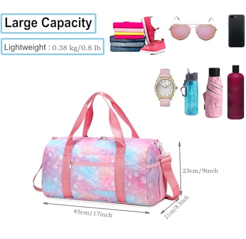 1.The size of the spacious ballet dance bag is 17”L*9”H*8.3”W.Our sport gym bag is roomy,but not too big for a kid to carry.It's perfect for an overnight or weekend stay at grandma's house.The travel duffle for girls has a large main compartment and many of small pockets to put your gym suit, shirts,pants, all clothes.Lots of small pockets could contain snacks,thermos,toiletries, makeup and all the little things.2.Our sports duffle bags for girls is made of water resistant polyester,lightweight,strong and durable,breathable and tear-resistant.Workout dance duffle bag easy to clean off after sports,built to last.3.Adorable girls duffel bag gymnastics sports bags for girls have a separate shoe compartment which can help you carry and keep your shoes better in your travel bag, even if it is dirty and the other objects still won't get stained.4.Girls kids duffle bag has adjustable and detachable shoulder straps, plastic hooks and shoulder straps ensure a fit and non-slip,make shoulder carrying more plush.Durable tote bag handle, make kids bags for girls more comfy to carry on the way to and from pool,fitness,travel or camping.5.Girls Gymnastics bag is a perfect reliable companion for both indoor and outdoor sports,could be served as a gym bag,sports bag,travel bag,workout bag,weekend bag,overnight bag,dance bag,cheerleading bag,swimming bag,gymnastics bag,beach bag,camp/airplane bag,ballet bags,carry-on luggage,sleepover bags,party bag,hospital bag etc Perfect for everyday use. premium materials and excellent craftsmanship ensure long-lasting durability.