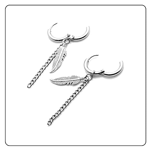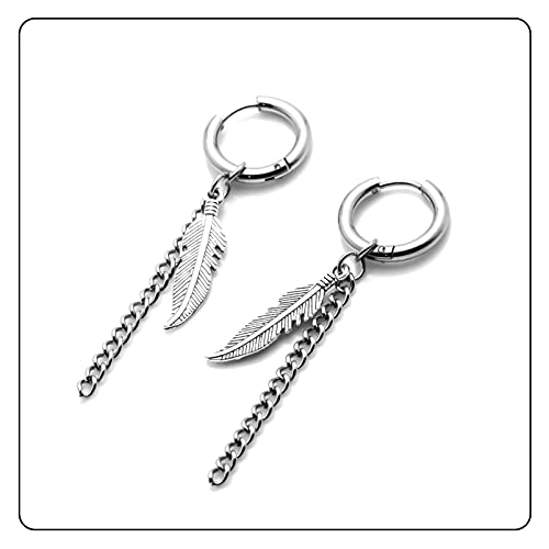 sizzling ! Punk Rock Stainless Steel Long Chain Earrings Feather Huggie Hinged Hoop Earrings,2PCS