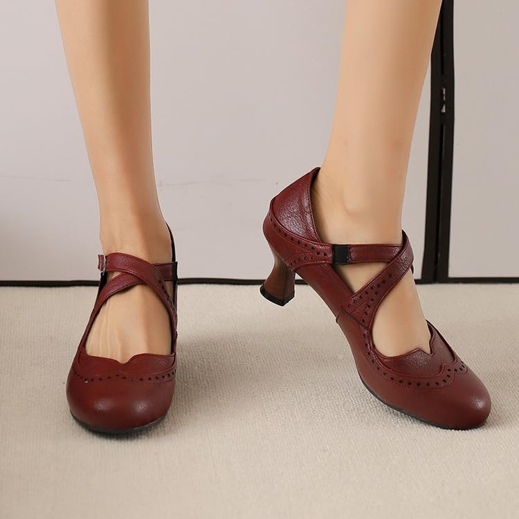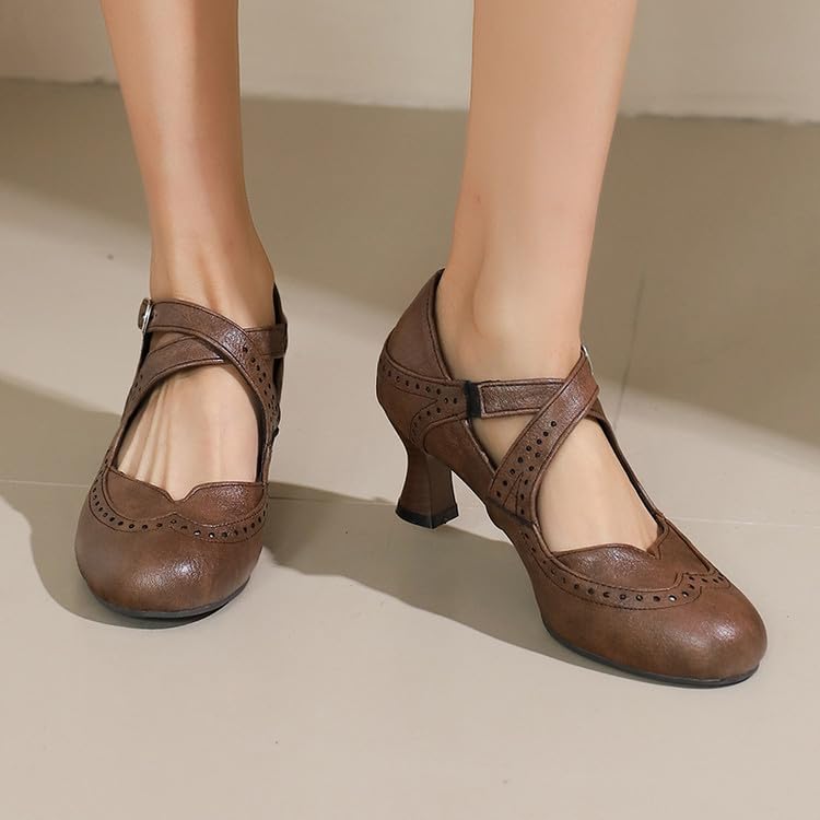 Women Brogue Mary Jane Pumps Spool Heel with Belt Buckle