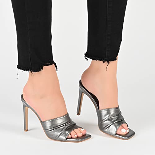 • Heel Height: 4-inch. Heel Type: Stiletto. Platform Height: Flat-inch. Shoe Width: Medium. Closure Type: Slip-on. Strap Type: Single Band. Toe Style: Open. Lining: Faux Leather. Upper Material: Vegan Leather. Outersole Material: Man-made. Footbed: 4 MM Tru Comfort Foam. each measurements are approximate and were taken using a size 6. Please note measurements may vary slightly by size.