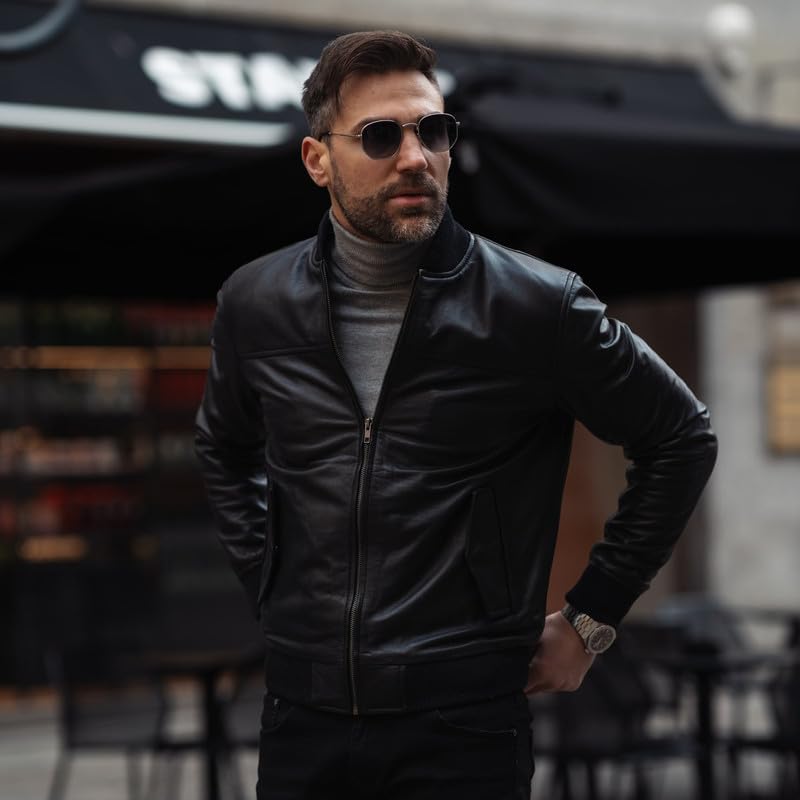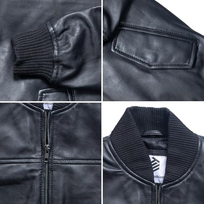 • Experience timeless style and ultimate comfort with our black leather bomber jacket featuring real leather, zipper closure, and rib-knitted collar. Unleash your inner fashion icon