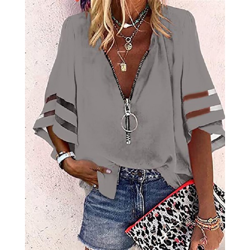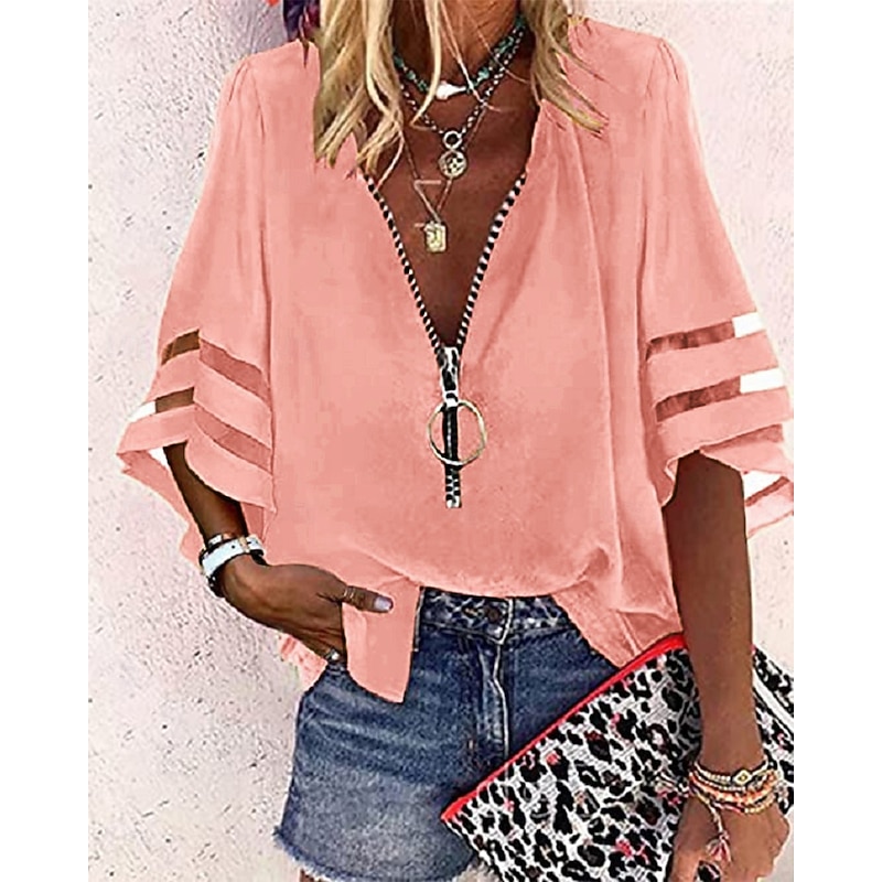 Highlights [Fabric] This sophisticated blouse is made from high-quality polyester, ensuring durability and a lightweight feel, making it perfect for all-day comfort. Its inelastic nature offers a structured and polished appearance suitable for various occasions. [Fit] Designed with a relaxed, flattering fit, this blouse is ideal for those seeking comfort without compromising on style. The flowing silhouette pairs seamlessly with a variety of bottoms, providing versatility in styling. [Design Highlights] Featuring a striking deep V-neck with a modern zipper closure, this blouse stands out with its large circular zipper pull for an edgy touch. The three-quarter length sleeves boast distinctive cut-out striped details, contributing to the garment's contemporary and airy aesthetic. [Occasions] Perfect for daily wear, holidays, and casual business settings, this blouse effortlessly enhances any wardrobe. Its vibrant yellow color adds a cheerful and lively element, making it suitable for both work and leisure environments. [Size Range] Available in a range of sizes from S to 2XL, this blouse accommodates a diverse array of body types, ensuring a perfect fit for every individual seeking elegance and comfort. Perfect for everyday use. premium materials and excellent craftsmanship ensure long-lasting durability.