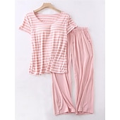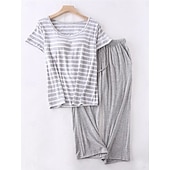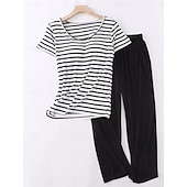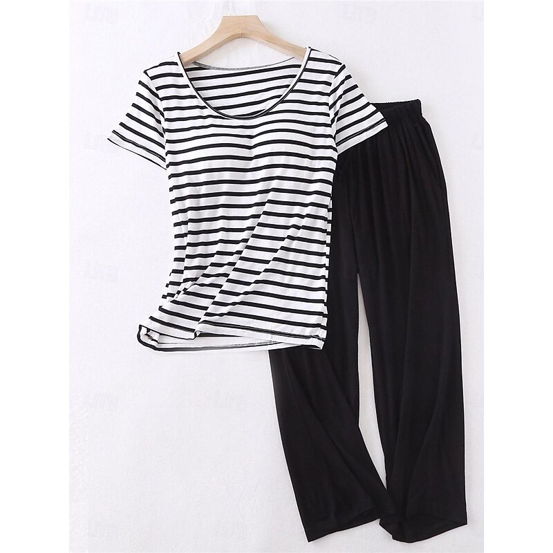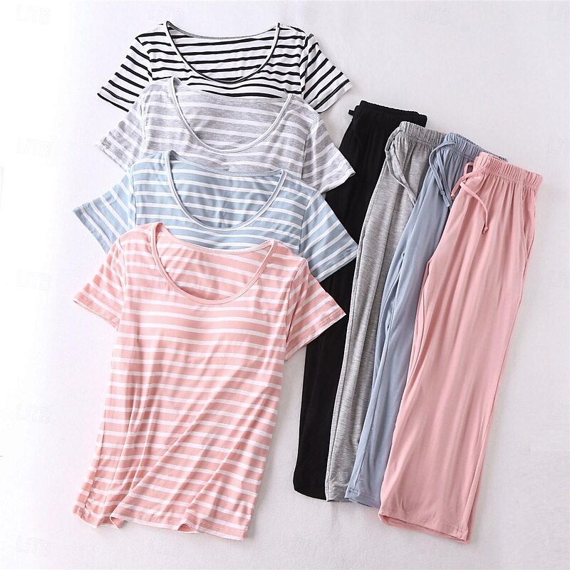 Women's Pajamas Sets Stripe Fashion Comfort Home Daily Bed Modal Breathable Crew Neck Short Sleeve T shirt Tee Pant Elastic Waist Chest pads Summer Home Outfits