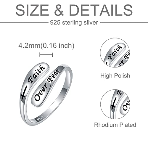 Ring size: AdjustableMaterial: Sterling SilverMetal type: Sterling SilverGem type: No GemstoneSimple Ring Engraving Inspirational Words:Faith Over Fear.God is so much bigger than any fear. Big or small, God is always greater. He is always there to stand by your side to help you face your fears and protect you in your weakest moments. Stay sturdy in your faith and he will always guide you.925 Sterling Silver:Fine 925 Sterling Silver Rings, the surface is superior rhodium plated, make the silver ring more bright and will not easily blacken or change color.Nickel-free, lead-free, no harm to health and does not contain any allergic element.Size:Adjustable rings are especially suitable as gifts when the recipient's exact finger size is unknown. (slightly adjustable to 6#-9#)Gifts for women,comes with jewelry gift box and perfect for gifting to your significant person on a festival or special meaningful day. It can also as a gift for yourself.Online shopping may be a difficult thing for you, so please feel free to contact us if you have any questions. We are committed to providing all customers with a better experience,your feedback will drive us forward! Perfect for everyday use. High quality materials and excellent craftsmanship ensure long-lasting durability.