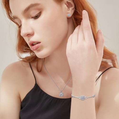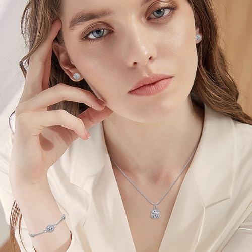 Hadskiss Silver Cubic Zirconia Earrings and Pendant Necklace Link Bracelet Set for Women 14K White Gold Plated Square Wedding Jewelry Sets for Bride Bridesmaid