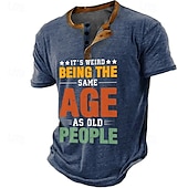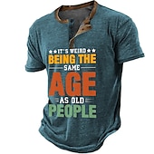 Highlights [Fabric] : This Men's Graphic Letters T-Shirt is crafted from a high-quality polyester fabric, offering a comfortable micro-elastic fit. The breathable material ensures easy wear throughout the spring and summer seasons. [Fit] : Designed with a regular fit, this shirt offers a relaxed silhouette that is perfect for everyday casual wear. The short sleeves and Henley neckline add to its classic and versatile style. [Design Highlights] : Featuring a humorous and eye-catching graphic print with the phrase "It's weird being the same age as old people," this t-shirt combines retro vintage charm with contemporary fashion. The 3D print adds depth and vibrancy to the playful and bold design. [Occasions] : Ideal for a variety of settings, this t-shirt is perfect for outdoor sports, holidays, and casual outings. Its modern and laid-back design makes it a great choice for expressing individuality and sense of humor. [Size] : Available in a wide range of sizes from S to 3XL, this shirt accommodates different body types, ensuring a comfortable fit for adults.