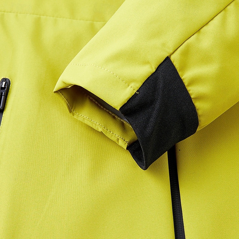 This sports coat is designed with a practical hooded neckline featuring adjustable drawstrings for customizable coverage. It includes a full-length zipper closure with a chin guard for added comfort. Secure zippered pockets on the chest and sides offer ample storage space for personal items. The raglan sleeves are engineered to enhance mobility, making it perfect for active individuals.