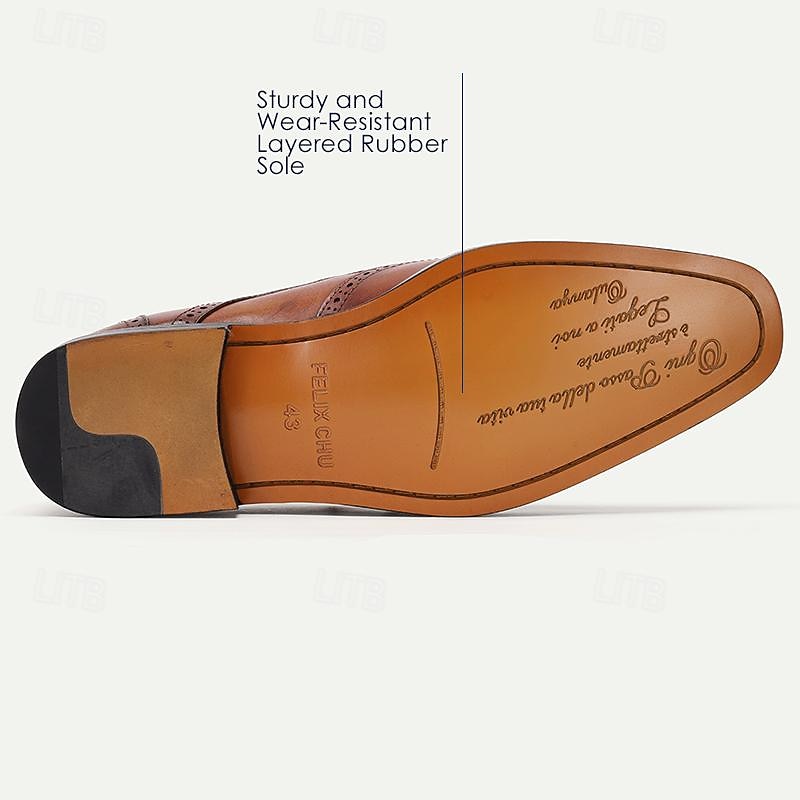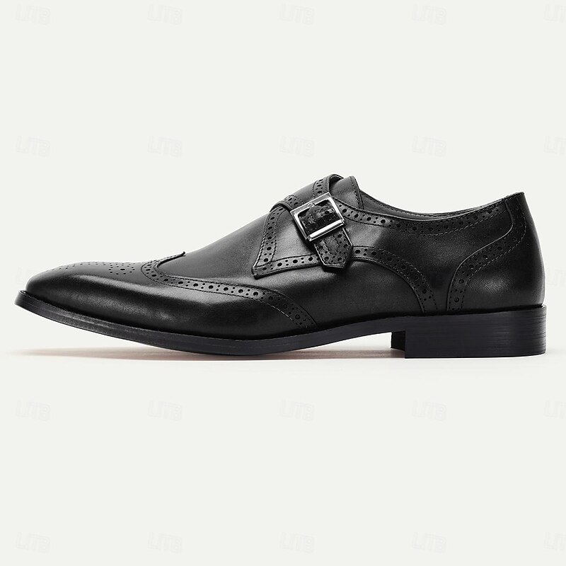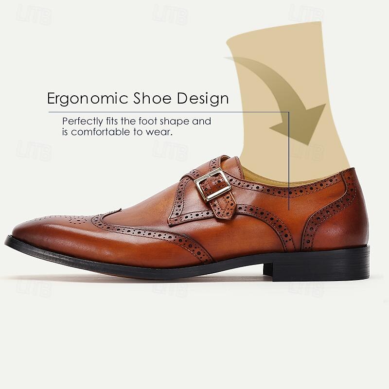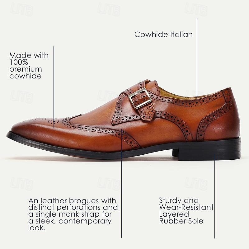 Highlights [Fabric and Construction] Expertly crafted from 100% premium Italian full-grain cowhide leather, these men's monk strap shoes offer a perfect blend of durability and sophistication. Featuring a sleek, polished finish, the shoes ensure long-lasting elegance for any occasion. [Style and Fit] The classic monk strap design provides a up-to-date twist on a timeless silhouette, complemented by a round toe shape for a comfortable fit. The intricate brogue detailing adds a touch of elegance and craftsmanship to the overall look. [Design Elements] Showcasing a traditional monk strap closure with a buckle, these shoes also feature geometric and color block patterns along with refined bullock carvings that elevate their trendy appeal. The inner lining made from cowhide leather ensures comfortable wear throughout the day. [Occasions] Perfect for formal and semi-formal events, these shoes effortlessly blend with suits or smart-casual attires, making them a versatile choice for weddings, business meetings, or evening gatherings. Their robust construction and slip-resistant rubber outsole provide excellent grip and stability. [Size Recommendations] Available in a range of sizes from US6 to US13 (corresponding to EU39 to EU46), these shoes offer a comfortable fit for a variety of foot shapes. Choose your true size for the best fit and enjoy the charm and sophistication these shoes bring to your wardrobe.