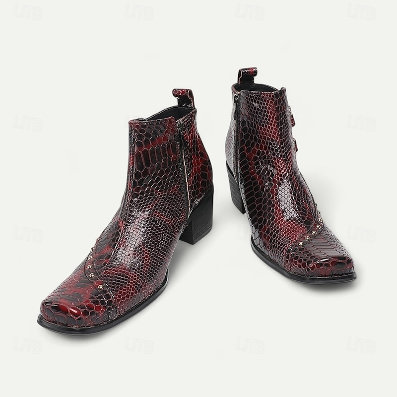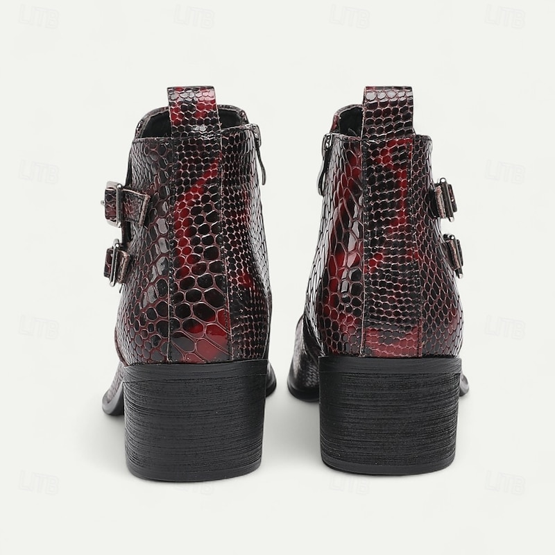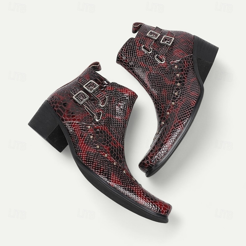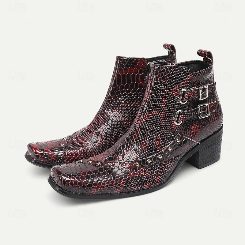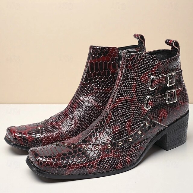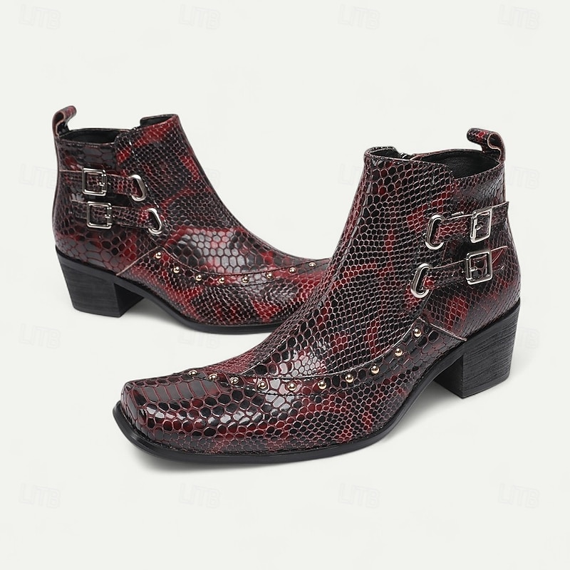 More information about Men's Red Snake Pattern Ankle Boots in Premium Cowhide Gothic Rock Style with Double Buckles for Nightlife Concerts and Motorcycle Outfits