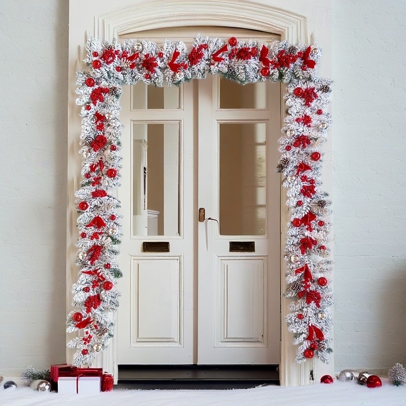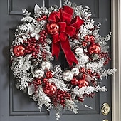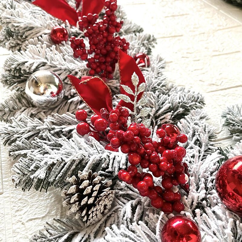 1, Enhance your Christmas decor with our artificial wreath adorned with glossy red and white ornaments, flocked pinecones, red berry clusters, and red ribbons for an authentic look.
