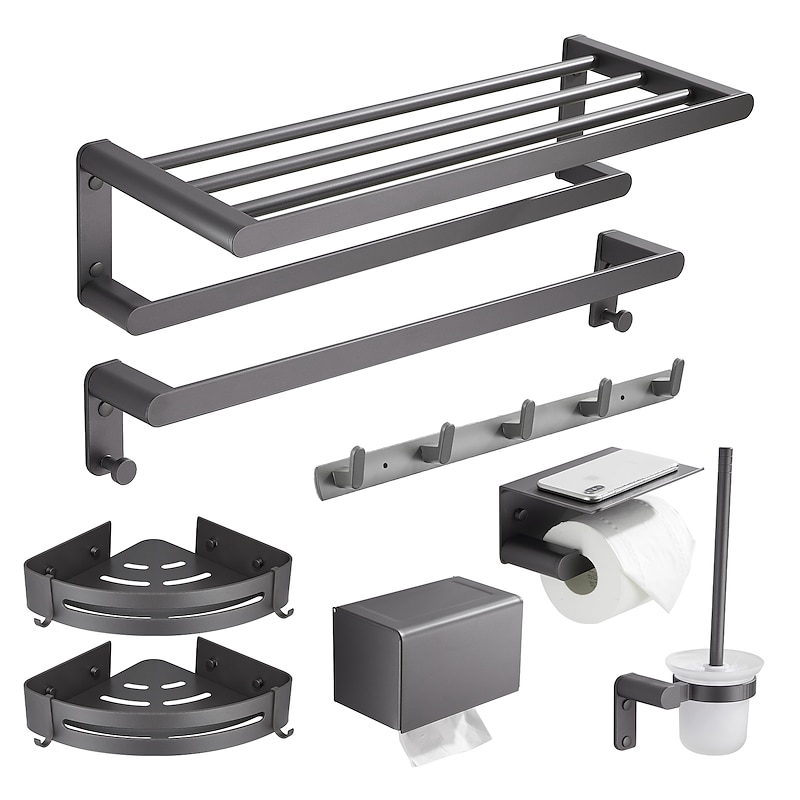This Bathroom Accessory Set,Bathroom Hardware Space Aluminium Wall Mounted Gun GreyTowel Rack /Corner Shelf/Robe Hook/Toilet Paper Holder/Towel Bar/Toilet Brush Holder combines elegant design with practical functionality. Every detail has been carefully considered to ensure you get the premier possible experience. The top-grade construction means this product will serve you well for years to come.