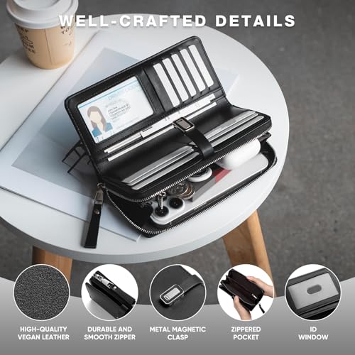 Brand: VulkittyColor: BlackMaterial: Faux LeatherStyle: Fashion Bifold Large WalletPattern: SolidPremium Eco-Friendly Material: Made from high-quality vegan leather, this women's wallet combines a sleek, minimalist design with practical interior space, offering both style and functionality.Ample Storage Space: Measuring 7.6Γ3.7Γ1.8 inches, this wallet features 11 credit card slots, 1 ID window, 1 cash compartment, 1 phone compartment, a zippered coin pocket, and 3 receipt slots, providing ample storage for all your essentials.Advanced Security: Equipped with RFID and NFC signal blocking technology, this wallet protects your personal information and financial data from unauthorized scanning and theft.Perfect Gift Choice: With its fashionable appearance and practical design, this women's wallet makes an ideal gift for girlfriends, wives, mothers, and sisters, suitable for any occasion.Exceptional Customer Service: We are committed to providing outstanding customer service. If you have any questions or concerns about our product, feel free to contact us anytime. Our dedicated support team will respond within 24 hours to ensure your satisfaction. Perfect for everyday use. superior materials and excellent craftsmanship ensure long-lasting durability.