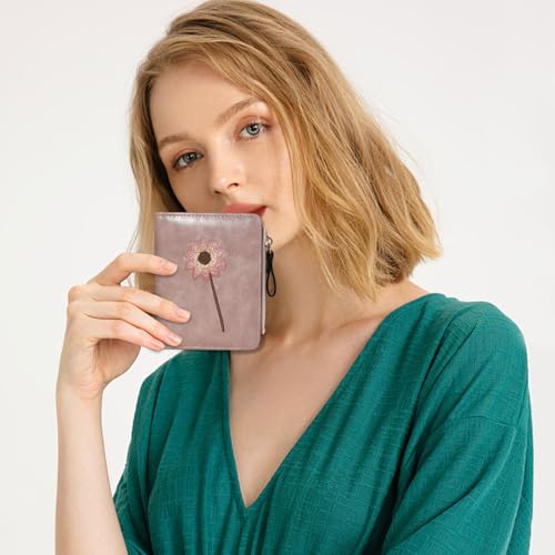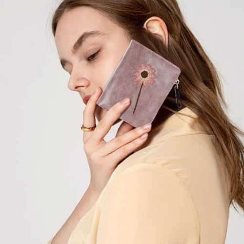 Wallet Women, Leather Bifold Card Holder Wallets for Women with Snap and Zipper, Flower Embroidery Printing Small Wallet with Coin Pocket and 6 Cards Slots (Pink)