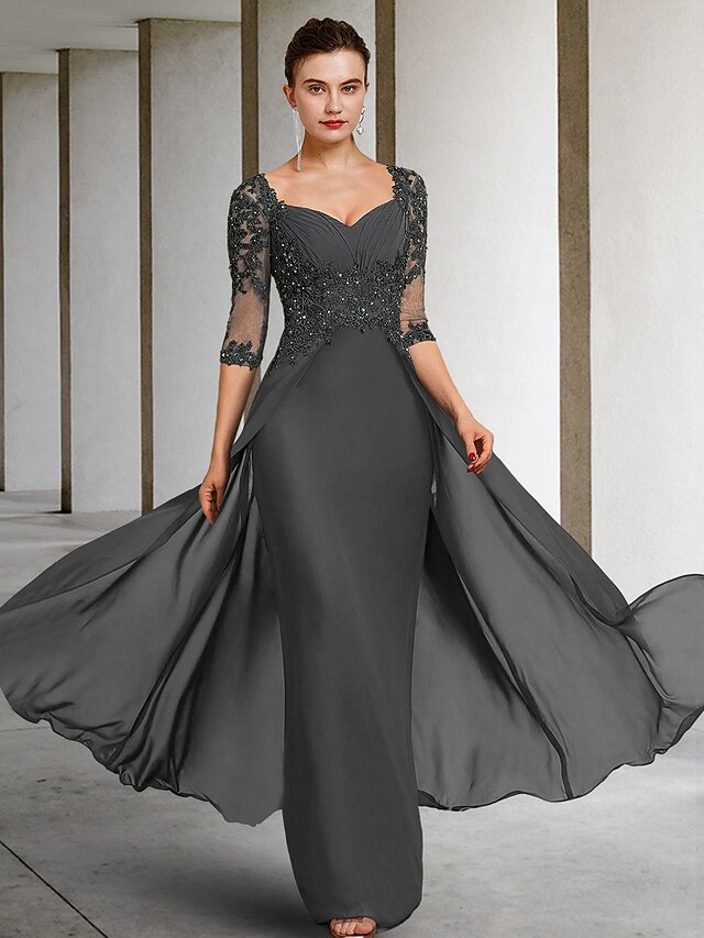 More information about Sheath Mother of the Bride Dress Formal Wedding Guest Elegant Party Square Neck Floor Length Chiffon Lace 3/4 Length Sleeve with Sequin Appliques Ruching