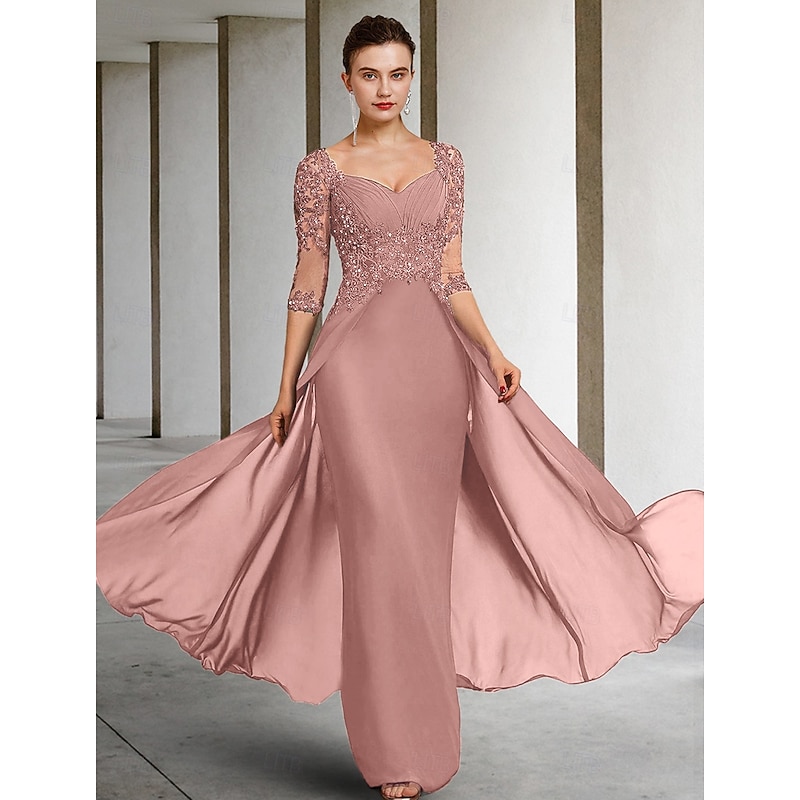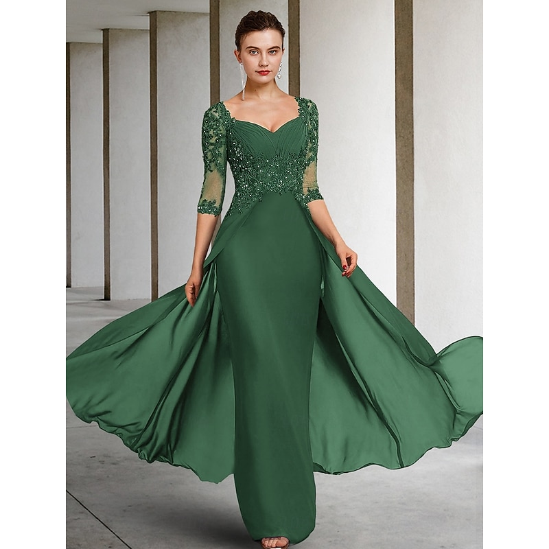 sizzling ! Sheath Mother of the Bride Dress Formal Wedding Guest Elegant Party Square Neck Floor Length Chiffon Lace 3/4 Length Sleeve with Sequin Appliques Ruching