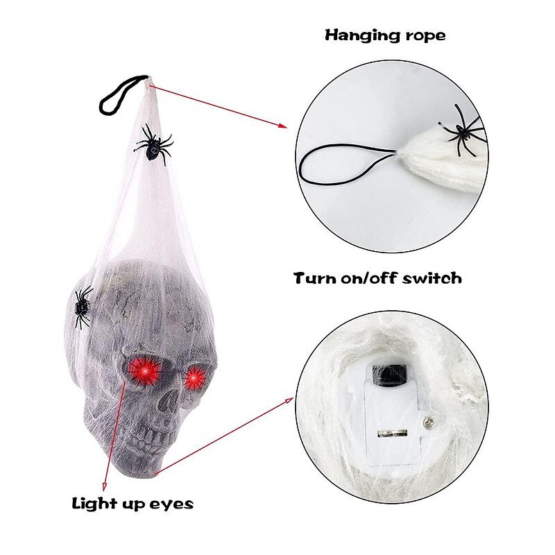 Highlights Description: Our Halloween Skull Decor is p erfect addition to your haunted house or Halloween party. This realistic LED skull features creepy red eyes that light up and a built-in motion sensor that activates when there are sounds like walking or talking nearby. Prepare to be terrified as the skull emits a horrifying scream and its eyes glow in the dark. With a hanging string, this versatile decoration can be placed anywhere indoors or outdoors, such as in your yard, on trees, gate entrances, or walls. Made from high-quality plastic and gauze, this tough and reusable skull measures 20 inches, making it an ideal indoor and outdoor Halloween yard decoration. It's the superb gift for Halloween enthusiasts and will surely become the focal point of any Halloween party or masquerade event. Get ready to create a spooky atmosphere with our Halloween Skull Decor! Notes: Due to the light and screen setting difference, the item's color may be slightly different from the pictures. Please allow slight dimension difference due to different manual measurement.