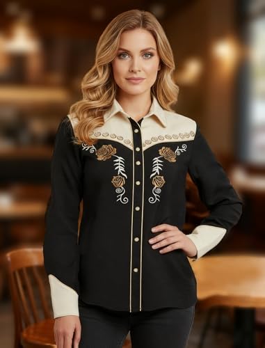 Women's Embroidered Western Cowgirl Snap Button Down Shirt with Stretch Long Sleeve Loose Blouse