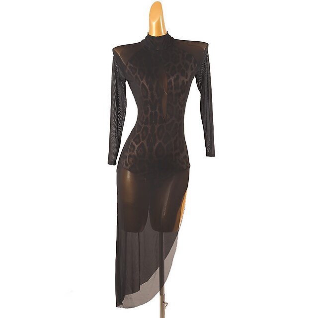 sizzling ! Dance Salsa Latin Dance Dress Leopard Print Tulle Women's Training Long Sleeve High Spandex Tulle