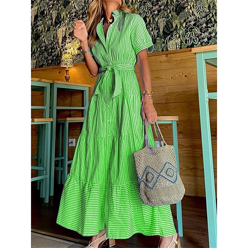 Women's Shirt Dress Casual Dress Stripe Lace up Ruffle Shirt Collar Long Dress Maxi Dress Vacation Short Sleeve Summer Spring