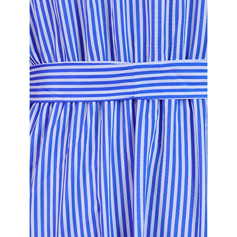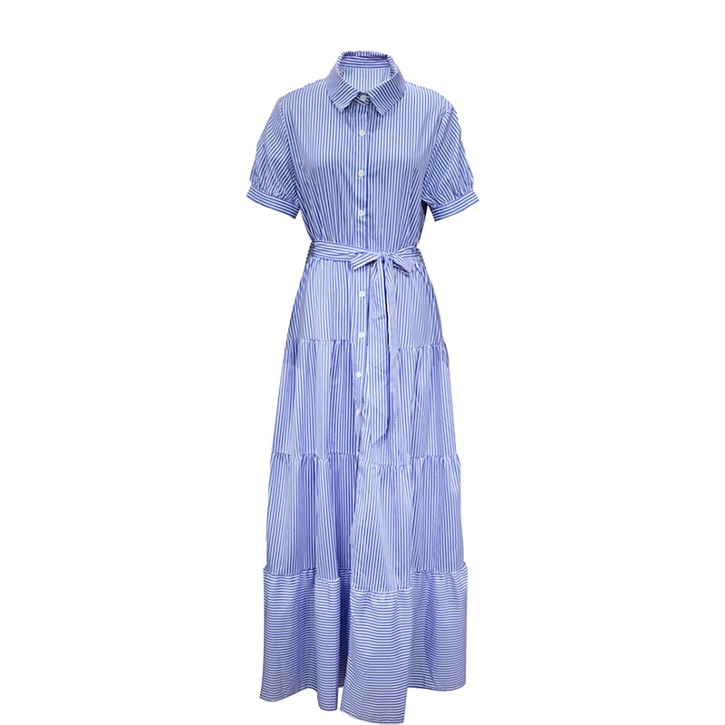 Highlights [Fabric] : Crafted from lightweight and breathable polyester, this dress offers comfort and ease, making it perfect for the warm spring and summer seasons. [Silhouette] : This A-line dress features a relaxed, loose fit that flatters a variety of body types. Its maxi length further enhances its elegant, yet casual appeal. [Design Highlights] : The dress showcases a classic button-down front with a chic shirt collar, adorned with a trendy vertical stripe pattern. The lace-up detail and subtle ruffle accents add an extra layer of sophistication, while the short sleeves provide a breezy, airy feel. [Occasions] : Ideal for vacations, street outings, and holidays, this versatile dress easily transitions from beachside strolls to city explorations, offering a stylish yet laid-back look. [Size Range] : Available in sizes S, M, L, XL, and 2XL, this dress provides options for a perfect fit, accommodating different body shapes and preferences. Perfect for everyday use. supreme materials and excellent craftsmanship ensure long-lasting durability.