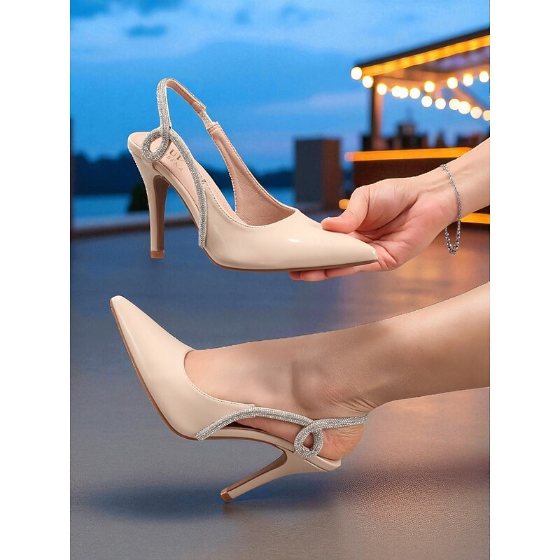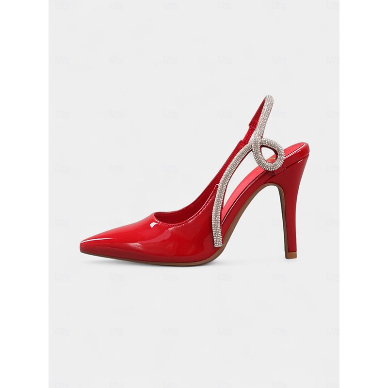 sizzling ! Women's Red Patent Leather Slingback High Heel Pumps - Pointed Toe Stiletto Dress Shoes with Rhinestone Trim for Cocktail Party & Formal Events