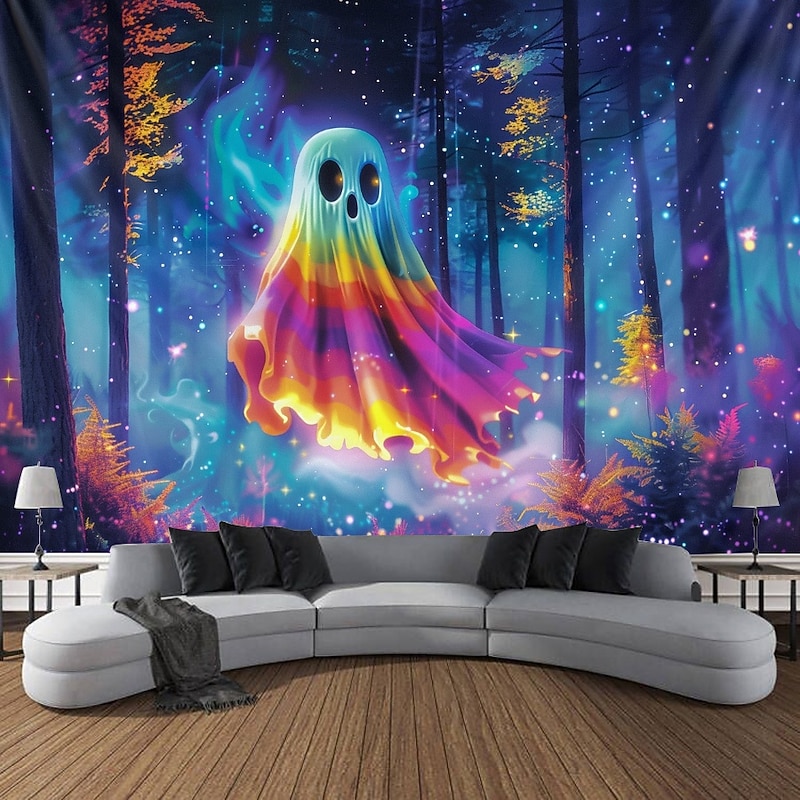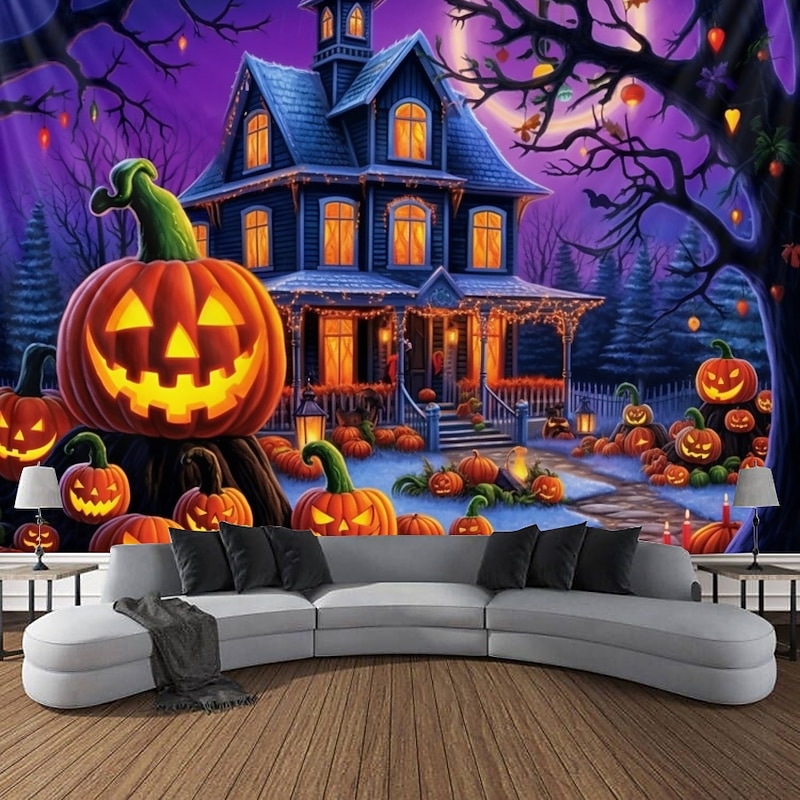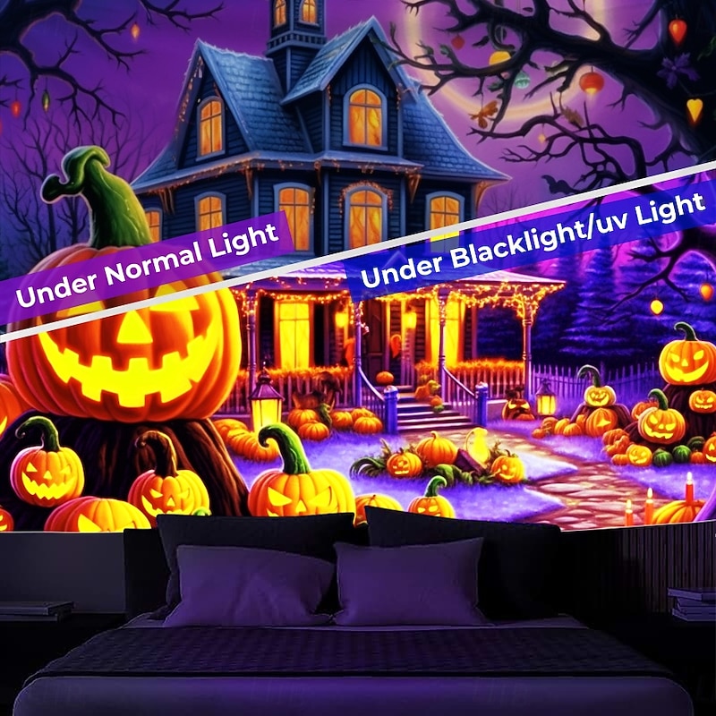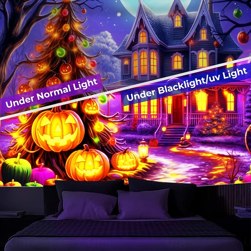 Halloween Decorations Blacklight Tapestry Pumpkins Halloween Trees UV Reactive Glow in the Dark Party Psychedelic Trippy Misty Hanging Tapestry Wall Art Mural for Living Room Bedroom Ghost Castle