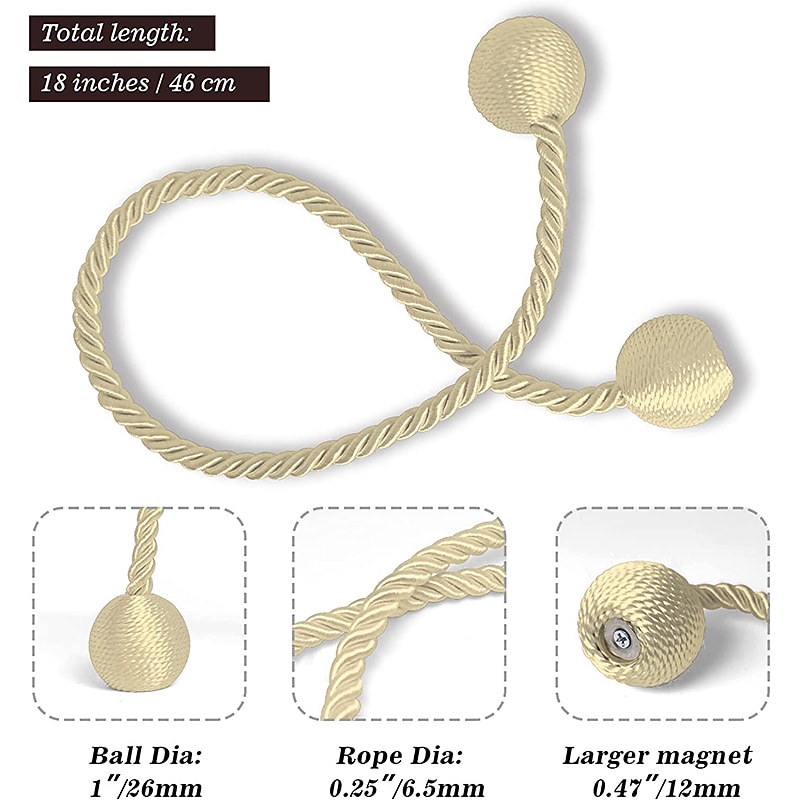 [Upgrade Powerful Magnetic] Our magnetic curtain tiebacks magnets use high-end new imported nickel-plated magnets, with strong corrosion resistance and durability, more magnetic than ordinary magnetic curtain tiebacks, and do not rust and not lose color. The rope of curtain tie adopts upgrade thickened solid polyester yarn, which is not only durable, but also not easy to wear or pilling.