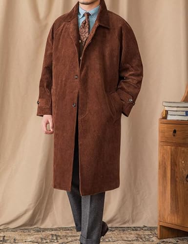ONAXTDA Men's Corduroy Stripes Overcoat Slim Fit Single Breasted Lapeled Casual Long Jacket Pea Coat with Pockets