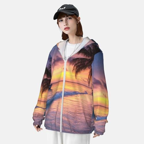 sizzling ! UPF 50+ Sun Protection Hoodie Long Sleeve Sunrise Tropical Island Sun Shirt Rash Guard Fishing Shirts for Men
