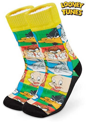 Fabric type: FleeceCare instructions: Machine WashPattern: CartoonLOONEY TUNES SOCKS --- these colourful and fun slipper socks by Looney Tunes feature a lively design with the most famous characters from the cartoon series: Daffy Duck, Bugs Bunny, Taz and Porky Pig! The men slipper socks come with anti slip pads and extra warm sherpa fleece lining: ideal for walking comfortably indoors. Great gifts ideas for boys, teens and adultsSLIPPERS SOCKS WITH EXTRA GRIP --- our slipper socks for men have been designed to be the perfect alternative to winter slippers, which is why they come with anti slip pads to ensure you the best grip on any type of tiles and floors. Their extremely soft fabric offers a warm feeling to the whole foot and toesSPACE JAM DESIGN --- the bright all over print is made to withstand frequent washing and to keep the colours like new! Looney Tunes socks will instantly become your favourite slipper socks and the perfect gift idea for any occasionONE SIZE --- our men's socks come in one size fits most teens and adults! Buy our mens slipper socks with grippers from home and enjoy the warmest and most cozy footwear you've ever triedGIFTS FOR MEN AND TEENS --- are you looking for gift ideas for teens or adults? These bed socks for men are a great and versatile gift for him: perfect to wear meanwhile lounging at home, relaxing on the couch or to keep the feet warm during cold nights! Buy these funny grip socks for dad, for your boyfriend, your brother and anyone you love! Perfect for gifting in any occasion Perfect for everyday use. superior materials and excellent craftsmanship ensure long-lasting durability.