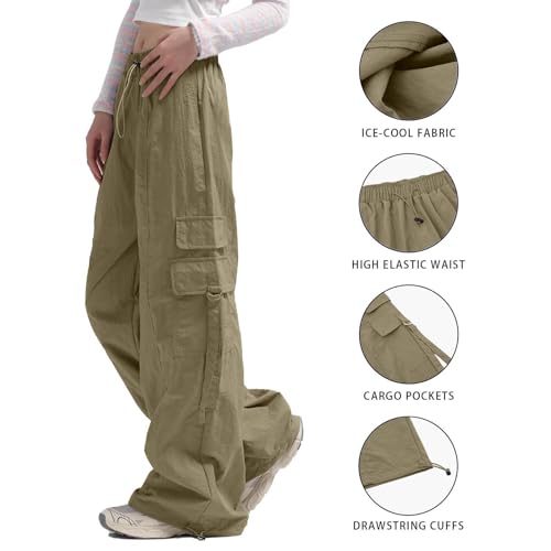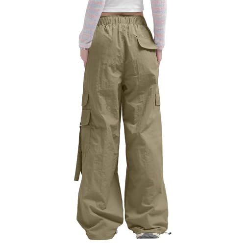 Parachute Pants for Women Wide Leg Cargo Pants Y2K Streetwear Casual Elastic Waist Hiking Trousers with Pockets