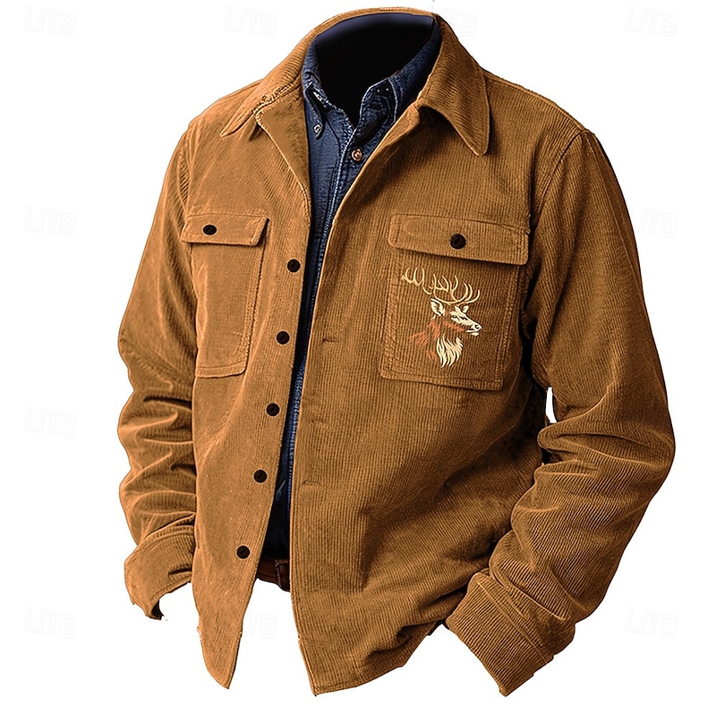 : Featuring a classic button-up front and collared neckline, the jacket is enhanced by a distinctive embroidered stag head on one of the two chest pockets, emphasizing a touch of vintage tribal style. The 3D print pattern further complements the rugged and masculine aesthetic, while the versatile olive green, navy blue, and brown colors add to its timeless appeal.